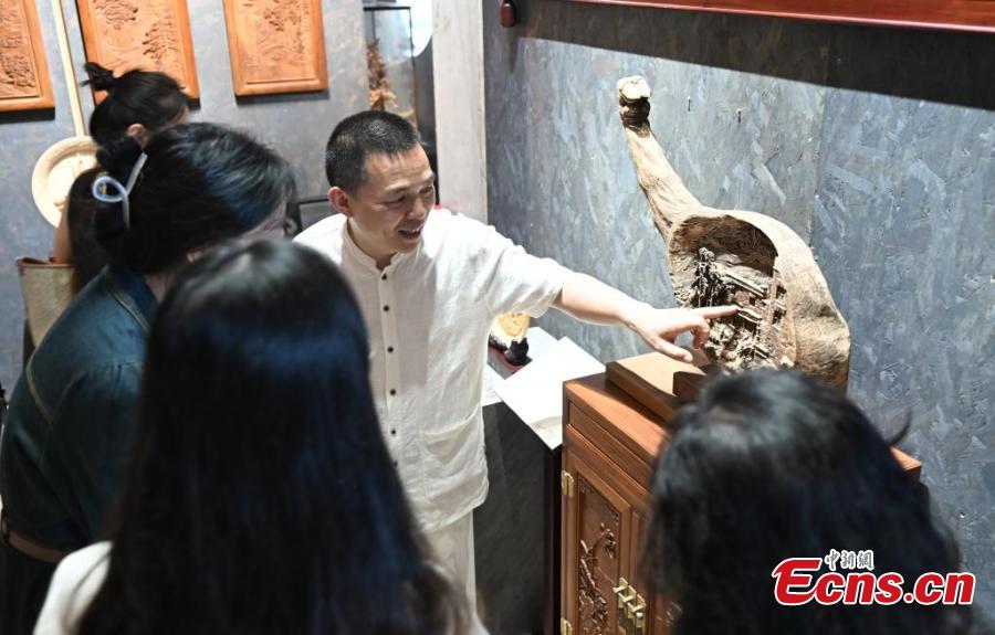 Hu Xianmin introduces his woodcarving works to visitors at his studio in Dongyang, Zhejiang Province, July 1, 2025. (Photo: China News Service/Wang Gang)