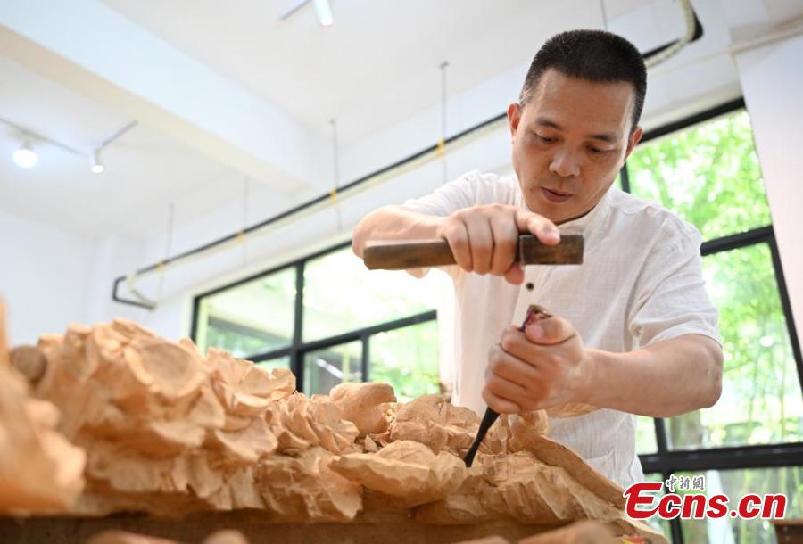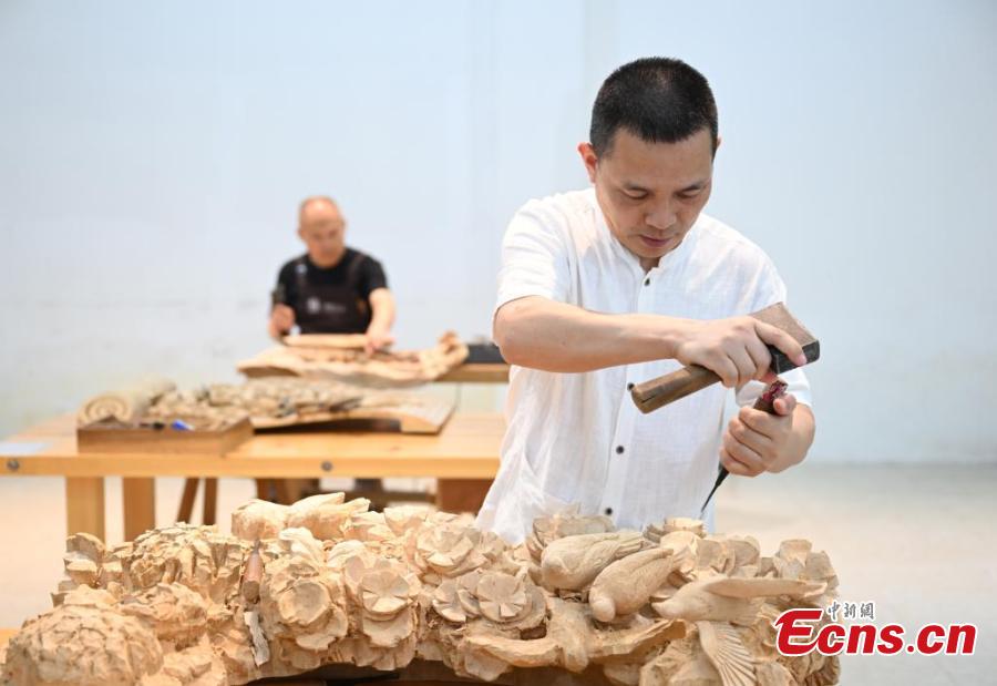 Hu Xianmin's apprentice Wu Xiangdong works on a woodcarving piece at the studio in Dongyang, Zhejiang Province, July 1, 2025. (Photo: China News Service/Wang Gang)