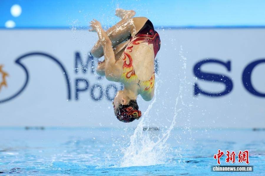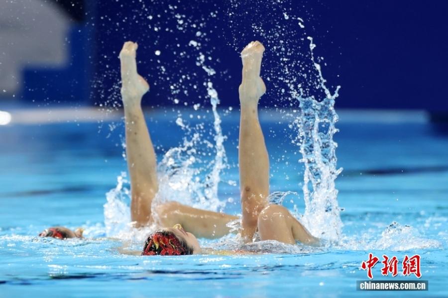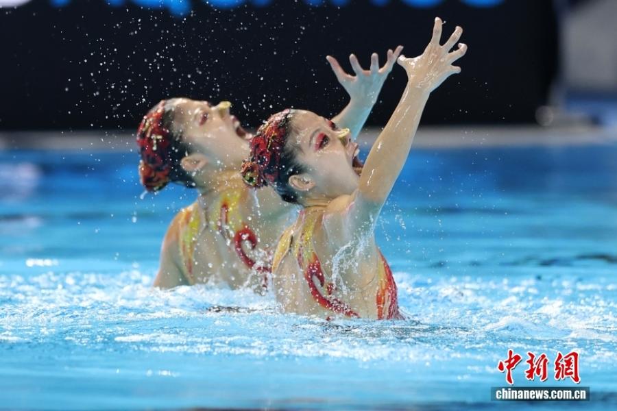 Lin Yanhan/Lin Yanjun of China perform during the women's duet technical final of artistic swimming at the World Aquatic Championships in Singapore, July 21, 2025. (Photo: China News Service/Fu Tian)