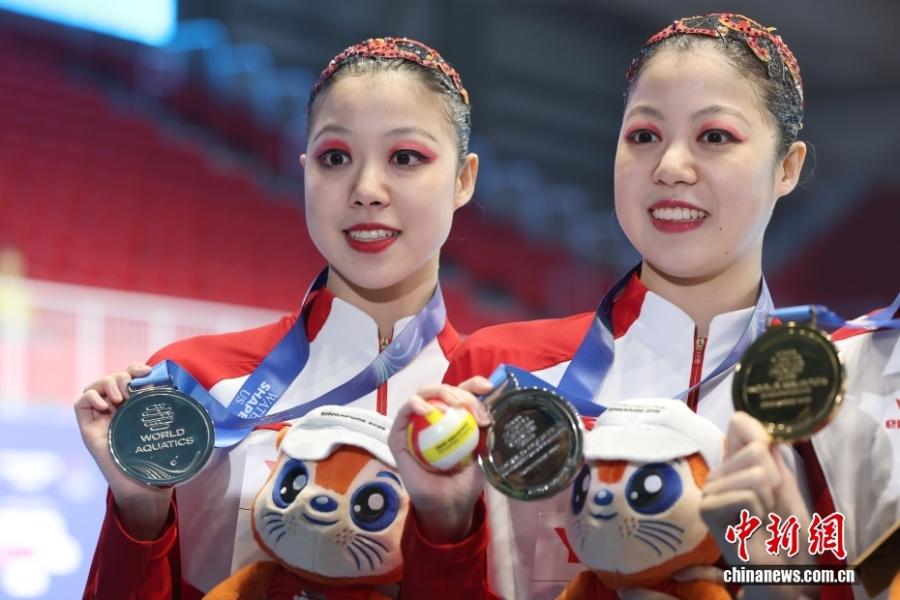 Silver medalists Lin Yanhan/Lin Yanjun of China hold their medals during the awarding ceremony for women's duet technical of artistic swimming at the World Aquatic Championships in Singapore, July 21, 2025. (Photo: China News Service/Fu Tian)