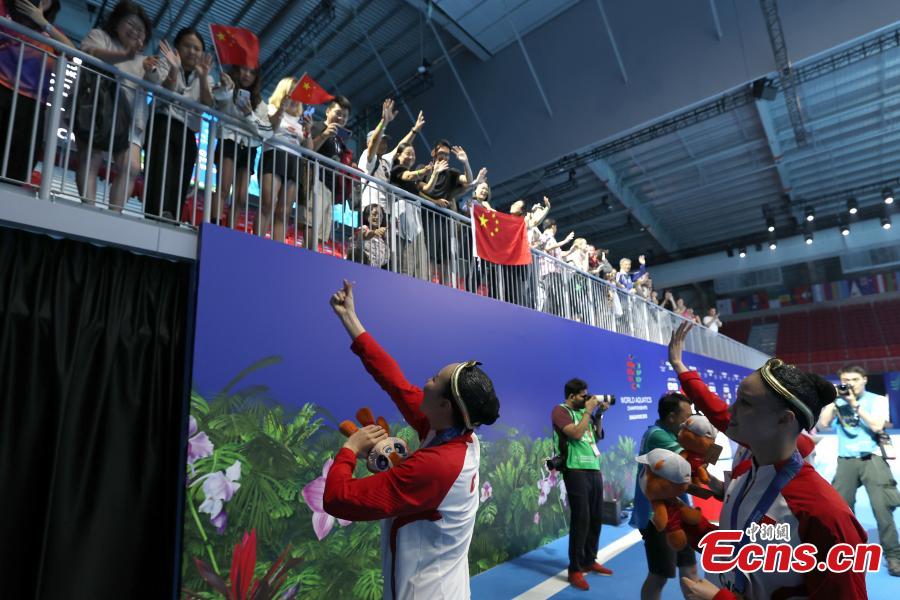 After the award ceremony, Team China members make heart gestures to swimming fans at the 2025 World Aquatics Championships in Singapore on July 22, 2025. (Photo/China News Service)