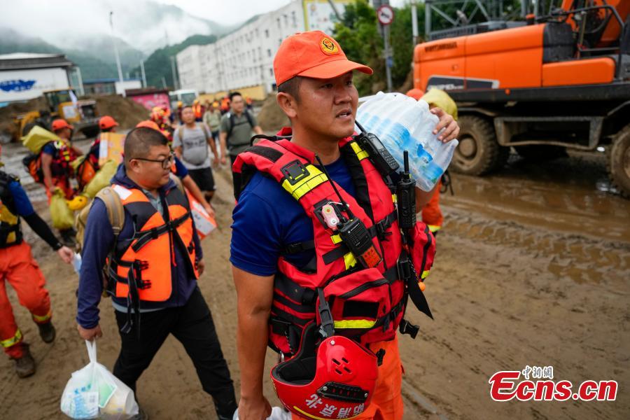 Firefighters carrying supplies walk on foot during rescue operations at Huairou District in Beijing July 28, 2025. (Photo/China News Service)