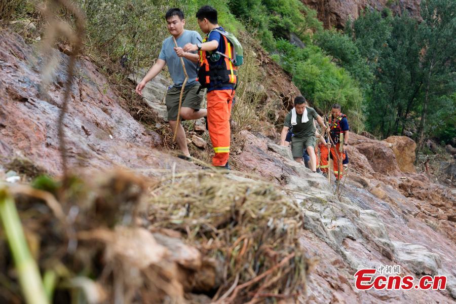 Firefighters assist stranded residents in descending the mountain at Huairou District in Beijing July 28, 2025. (Photo/China News Service)