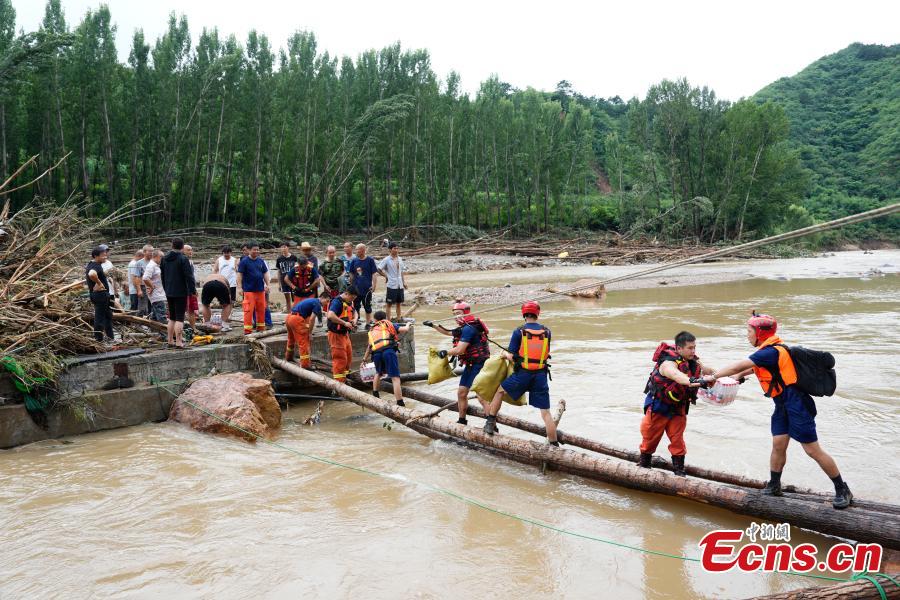 Firefighters transport supplies across a temporary wooden bridge at Huairou District in Beijing July 28, 2025. (Photo/China News Service)