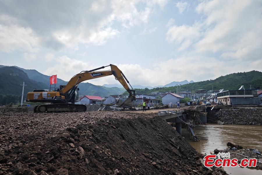 A damaged Laogongying bridge is under repair at Huairou District in Beijing July 28, 2025. (Photo/China News Service)