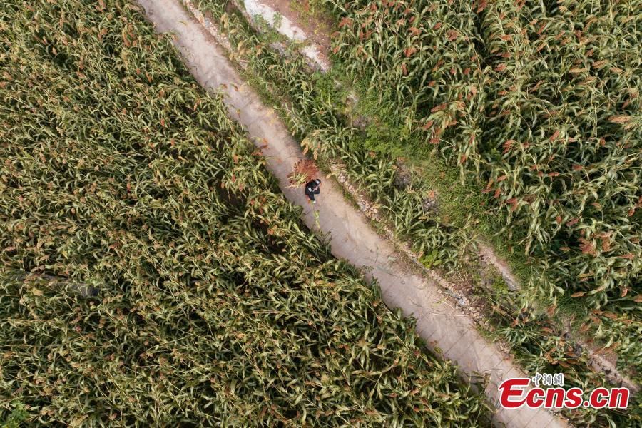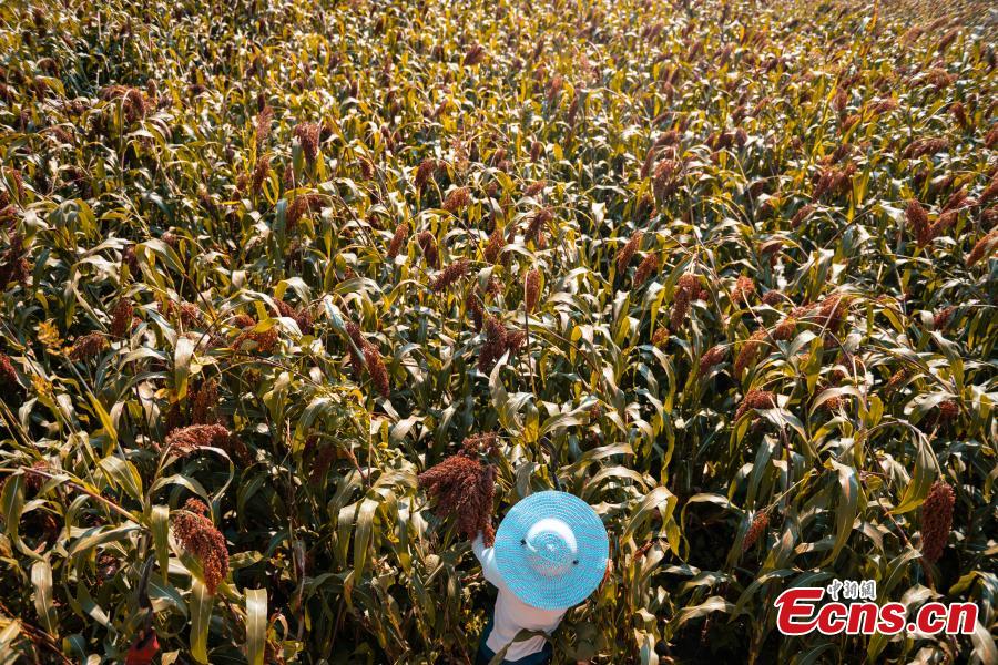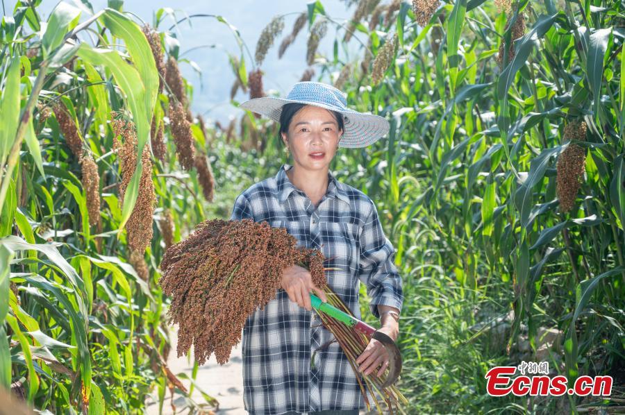 A farmer harvests sorghum in the filed at Meijiuhe Town, Zunyi City, Guizhou Province. (File photo/China News Service)