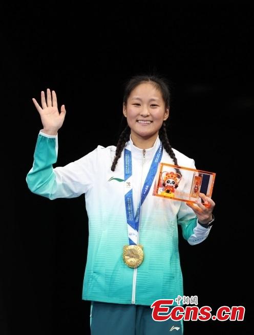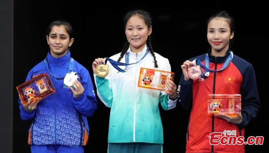 Chinese athlete Chen Mengyue poses at the award ceremony, who defeats India's Namrata Batra 2-0 to claim the championship in women's 52kg Sanda (Chinese kickboxing) final at the 2025 Chengdu World Games on Aug. 12 2025. (Photo/China News Service)