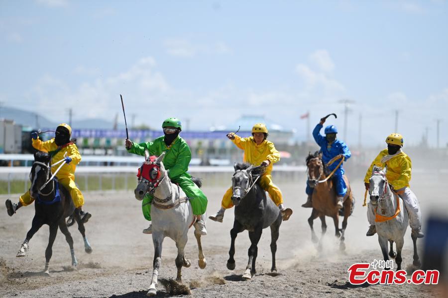 Riders compete at the opening ceremony of Gesar horse racing festival on Aug. 13, 2025 in Maqu County, northwest China's Gansu Province. (Photo/China News Service)