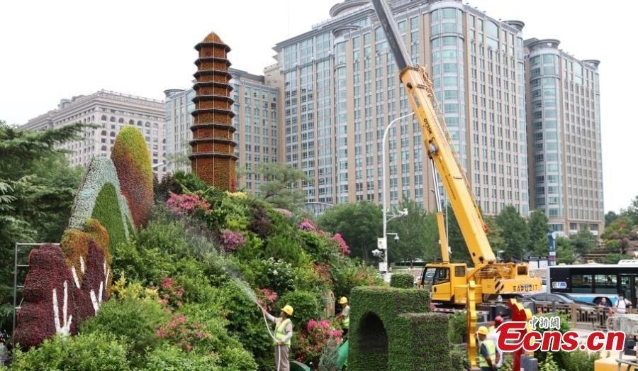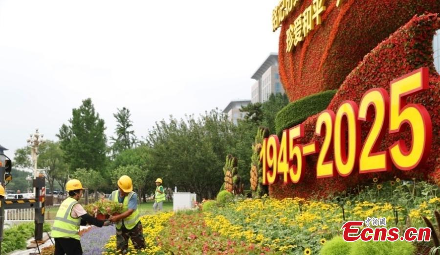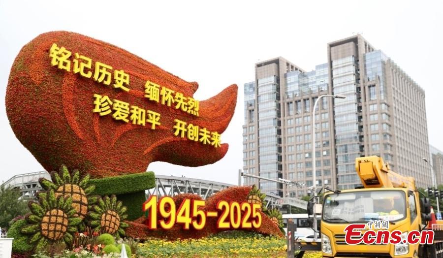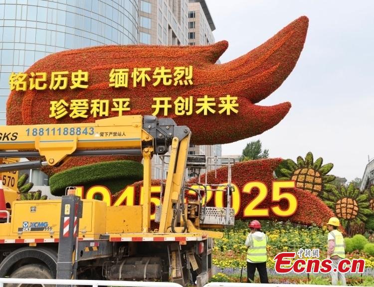 Workers installs floral decorations to mark 80th anniversary of victory in Chinese People's War of Resistance Against Japanese Aggression in Beijing on Aug. 14, 2025. (Photo/China News Service)