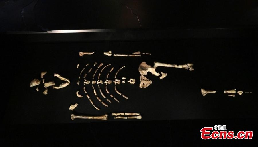 Australopithecus "Lucy" fossils are displayed in the exhibition at the Czech National Museum on Aug. 25, 2025. (Photo/China News Service)