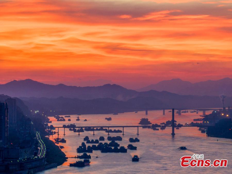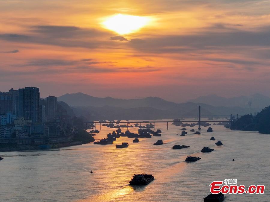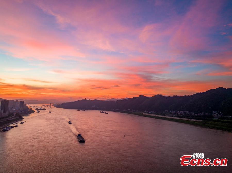 Photo taken on Aug. 30, 2025 shows the golden waterway of the Xijiang River in Wuzhou City, south China's Guangxi Zhuang Autonomous Region, bathe in the rosy hues of dawn. (Photo provided to China News Service)