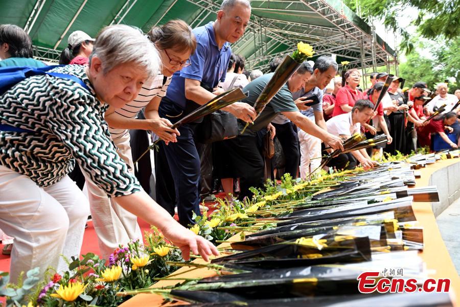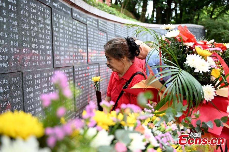 Representatives from various sectors present flowers to the Memorial Wall for Resistance Fighters on Aug. 31, 2025 in Fuzhou, southeast China's Fujian Province. (Photo:China News Service/Lv Ming)