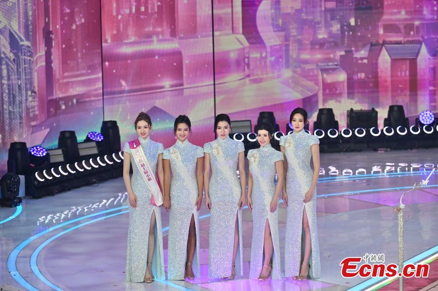 The top five contestants of the 2025 Miss Hong Kong Pageant are on stage on Aug. 31, 2025. (Photo: China News Service/Li Zhihua)