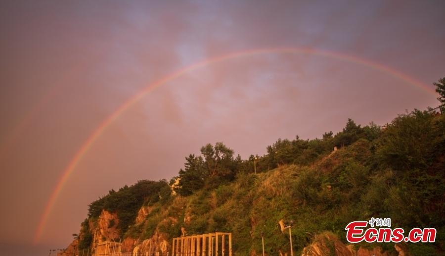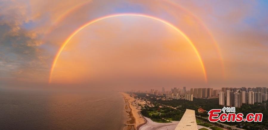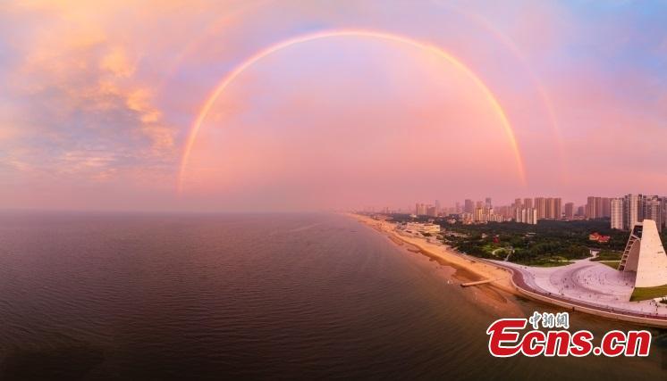 Photo taken on Sept. 3, 2025 shows a splendid scene of a rainbow and rosy clouds appears together in the sky over Yantai City, east China's Shandong Province. (Photo/CFP)