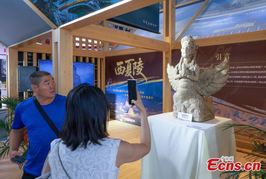 Visitors view a replica of the cultural relic of Xixia Imperial Tombs?at the 2025 China International Fair for Trade in Services in Beijing on Spet. 14, 2025. (Photo: China News Service/Jia Tianyong)