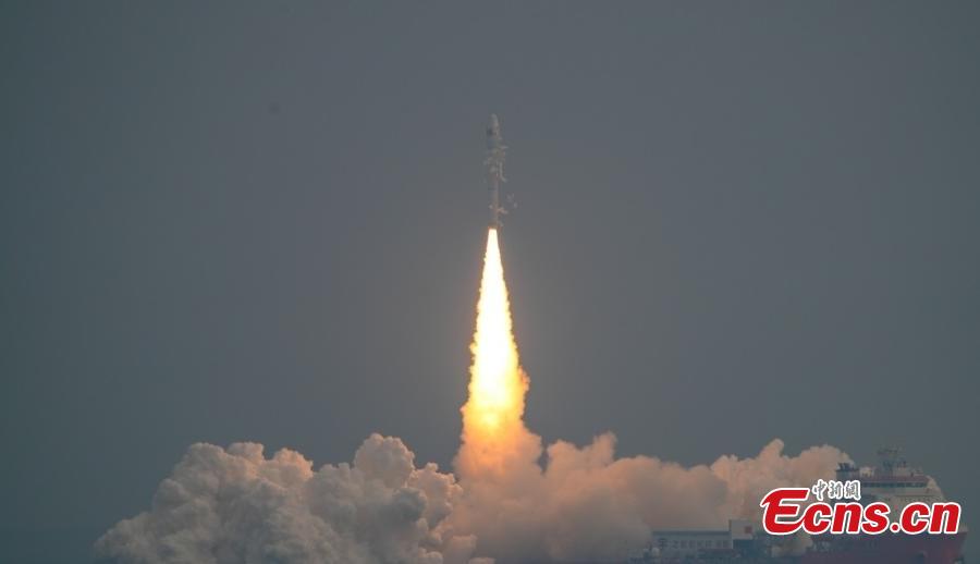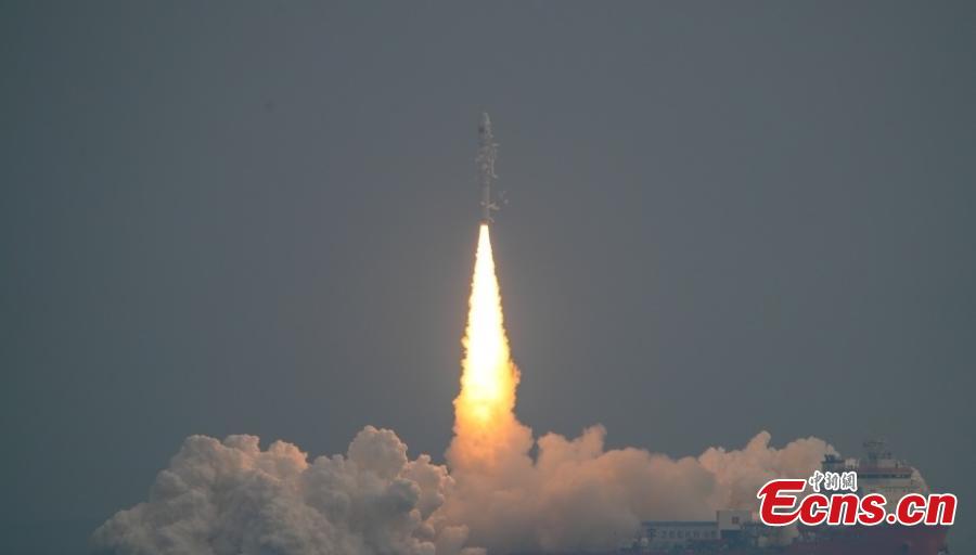 A Smart Dragon-3 rocket carrying the Geely-06 constellation satellites blasts off from the sea near the city of Rizhao, east China's Shandong Province, Sept. 24, 2025. (Photo: China News Service/An Di)