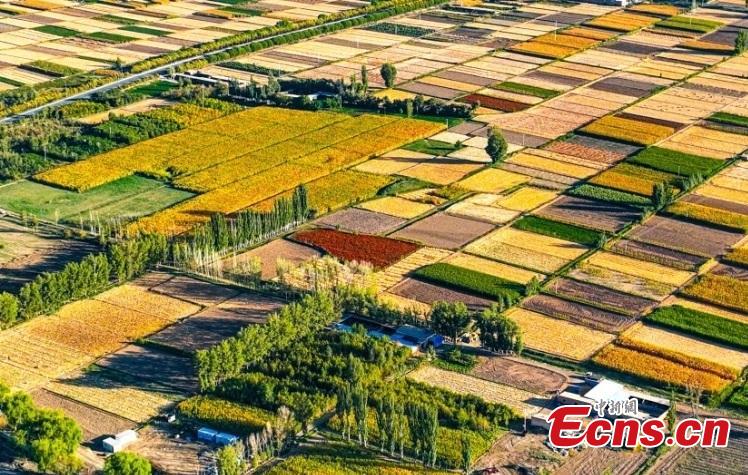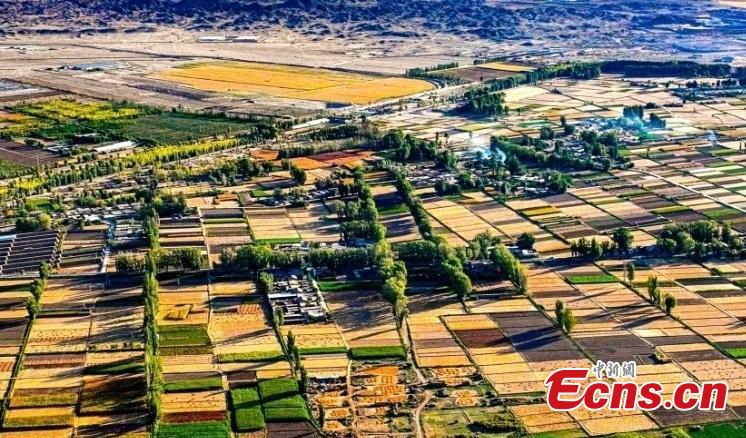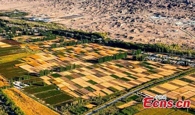 An aerial view shows vast golden fields as crops enter the harvest season in Gaotai County, northwest China's Gansu Province, Sept. 24, 2025. (Photo/Sipaphoto)