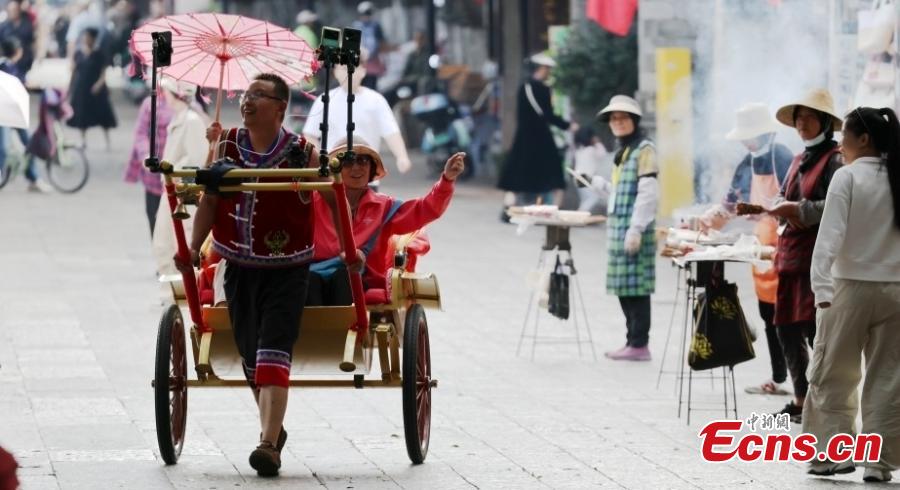 A tourist rides in a rickshaw through Tianshui ancient town in Tianshui County, southwest China's Yunnan Province on Sept. 24, 2025. (Photo provided to China News Service)
