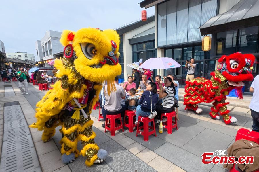 Drone photo taken on Sept. 27, 2025 shows a lion dance performance during a Long Street Banquet in Taihe Town of Dongpo District, Meishan City, Sichuan Province. (Photo: China News Service/Liu Zhongjun)