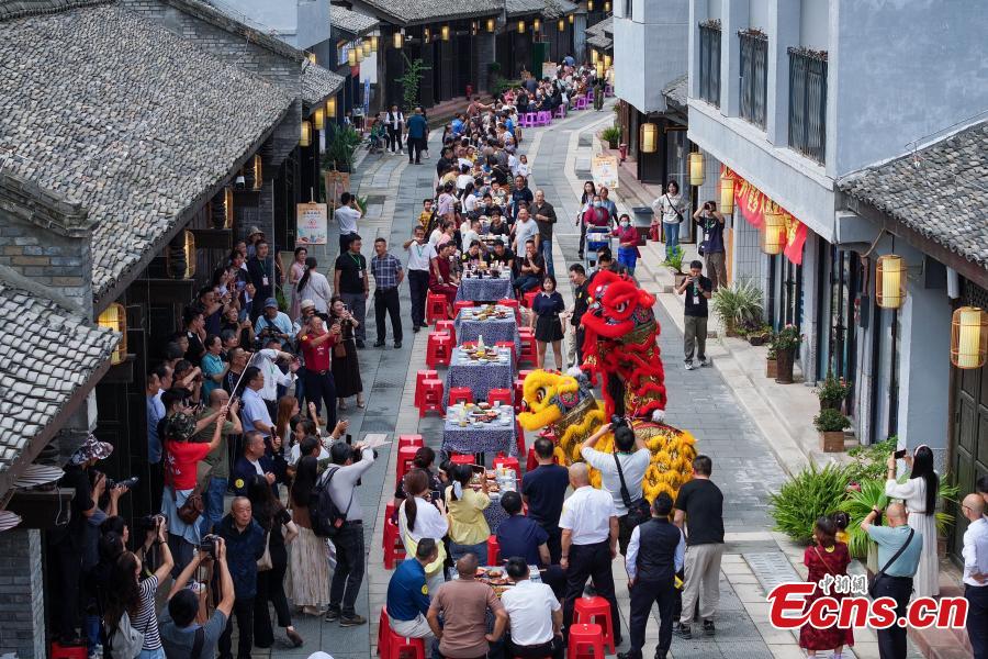 A Long Street Banquet was held in Taihe Town on Sunday, with classic dishes such as cold chicken, Dongpo pork knuckle, and Taihe crucian carp served, drawing more than 400 diners to taste.