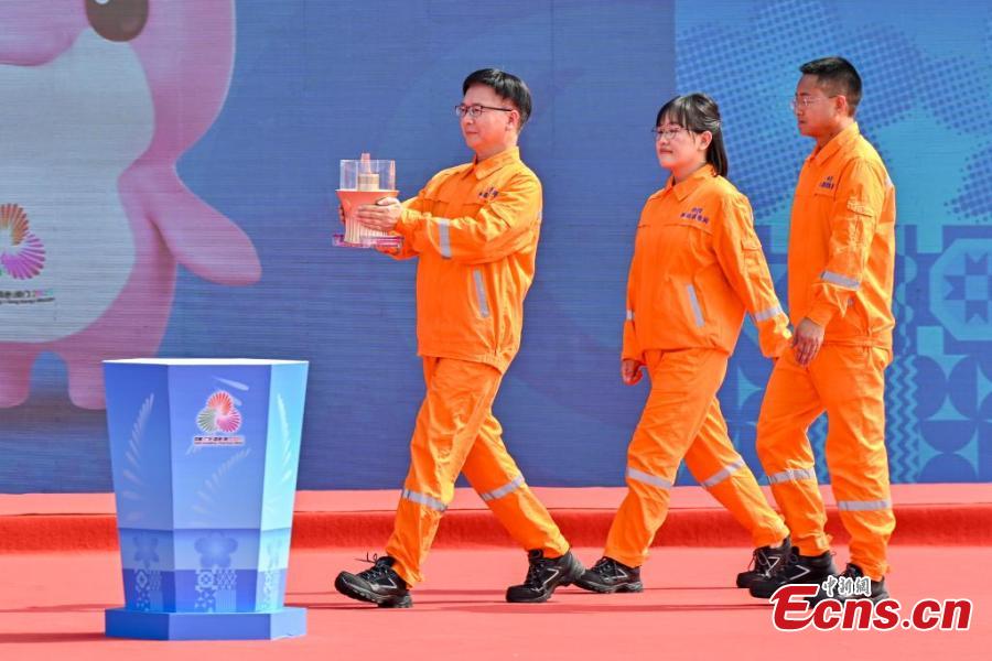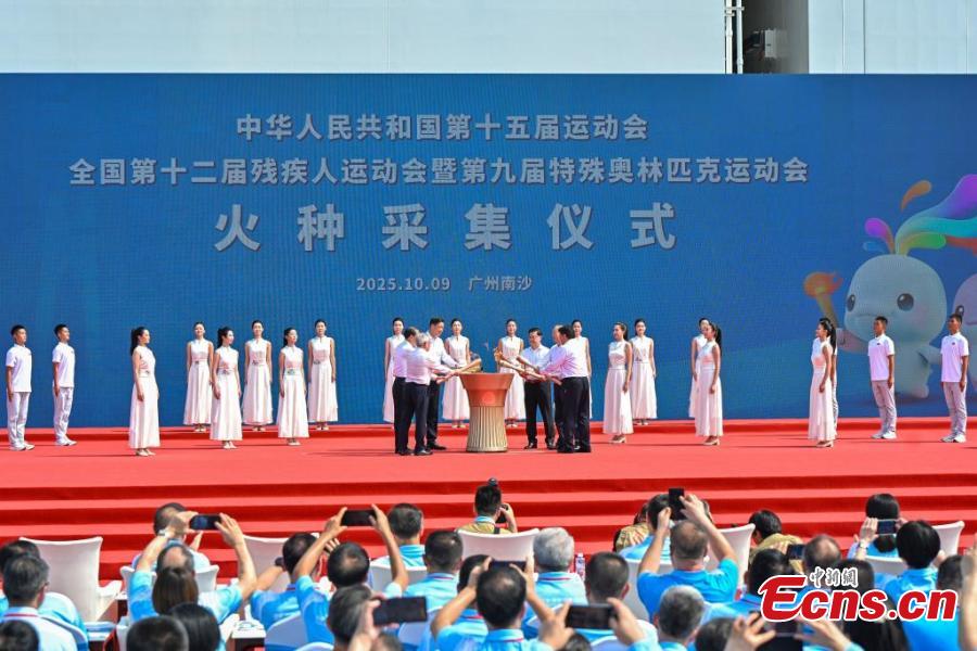 The flame collection ceremony for the 15th National Games and the 12th National Games for Persons with Disabilities & 9th Special Olympics took place at the Guangzhou Marine Geological Survey scientific research wharf in Guangdong Province, Oct. 9, 2025. (Photo: China News Service/Chen Jimin)