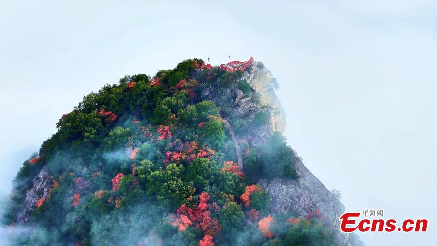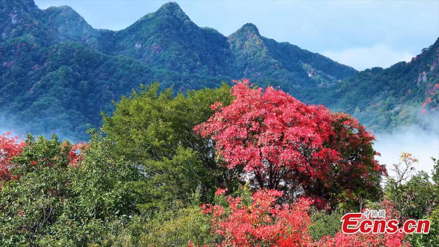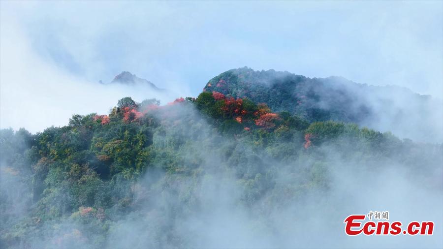 After the rain, stunning autumn scenery emerged on the?Cuihua Mountain of the Qinling Mountains in Xi'an, northwest China's Shaanxi Province. Red leaves and a sea of clouds framed a breathtaking view. The crimson foliage glowed like flames among the mountains, while clouds rolled over the peaks like waves, forming a magnificent autumn panorama.