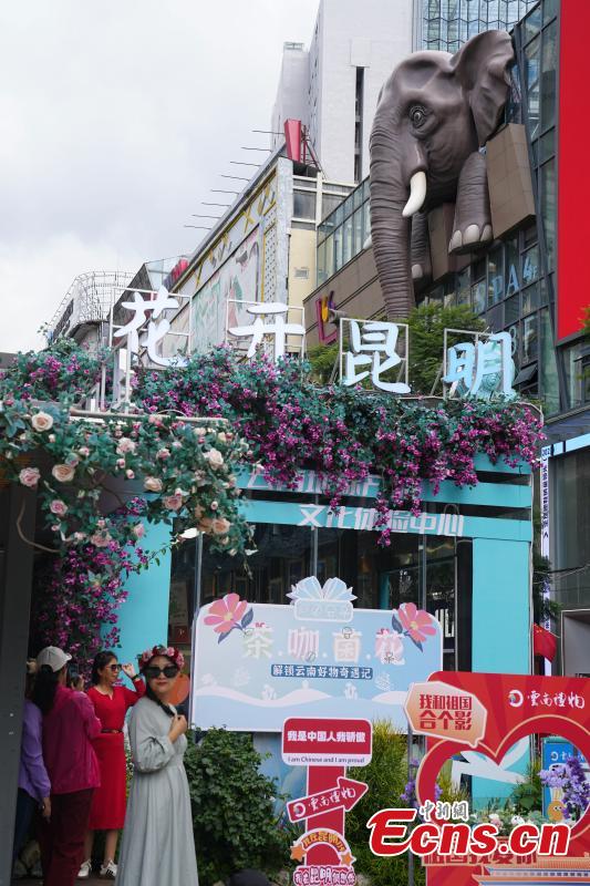 An elephant-themed art installation that seems to break through the wall attracts visitors to take photos in Kunming, southwest China's Yunnan Province, on Oct. 10, 2025. (Photo: China News Service/Liu Ranyang)