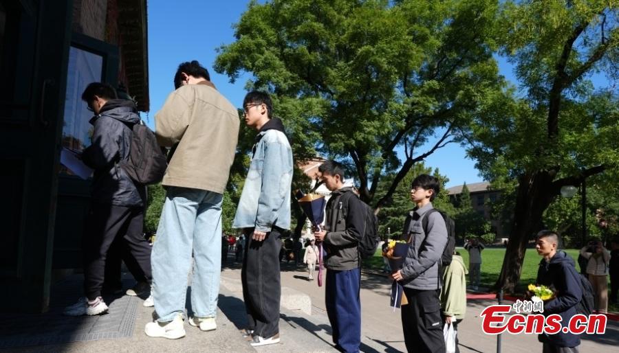 Students wait in line to enter the memorial room to pay deep tribute to Yang Zhenning at Tsinghua University Institute for Advanced Study on October 19, 2025. (Photo: China News Service/Jiang Qiming)