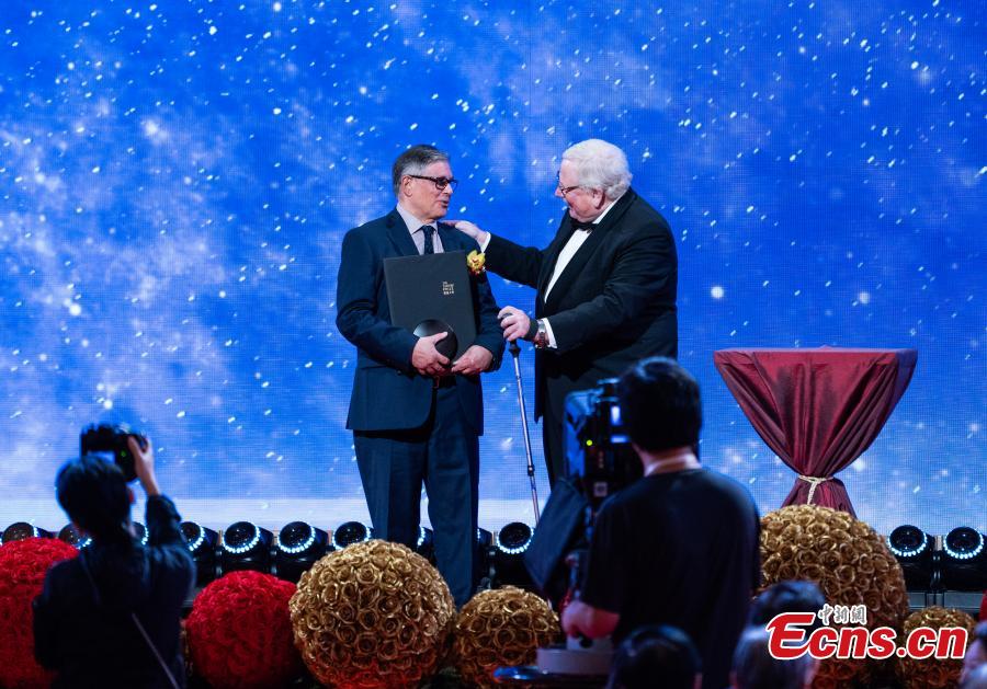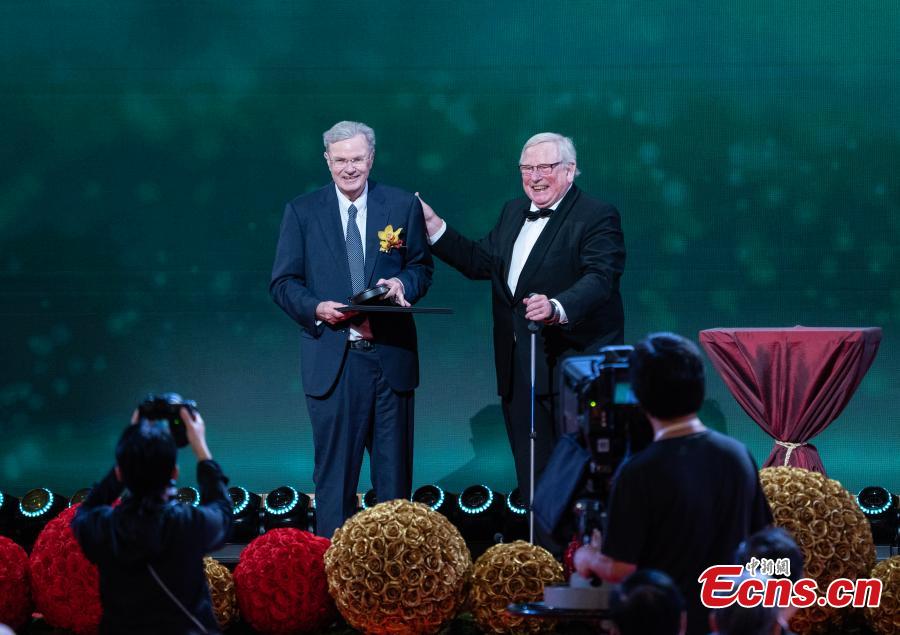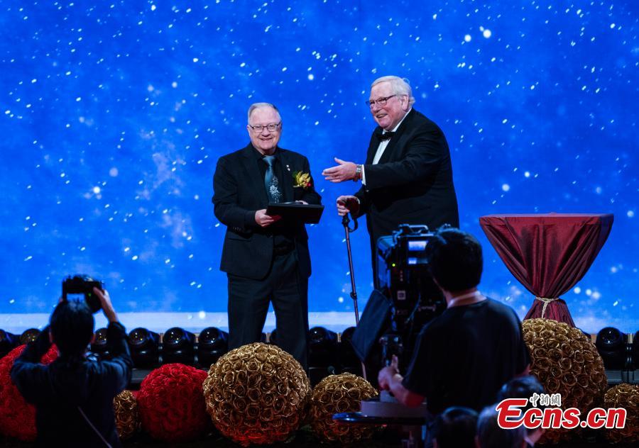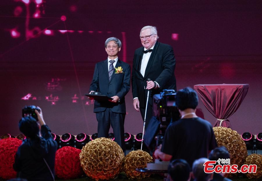 John Richard Bond (left) receives the award from Reinhard Genzel, chair of the Board of Adjudicators of the Shaw Prize Foundation, at the Grand Hall of the Hong Kong Convention and Exhibition Centre in Wanchai, Hong Kong on Oct. 21, 2025. (Photo: China News Service/Hou Yu)