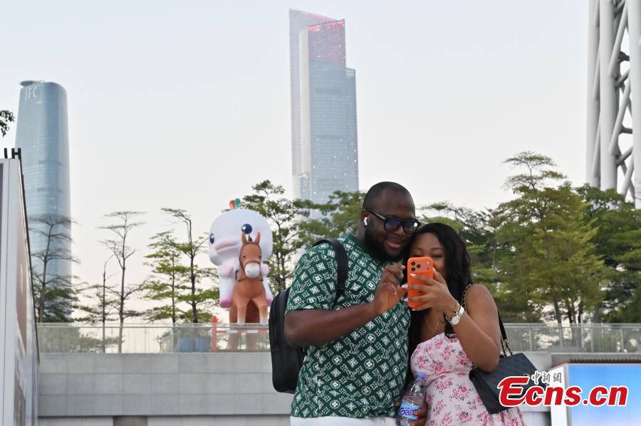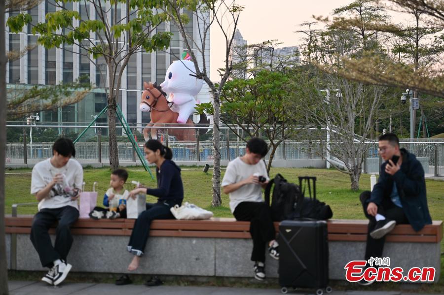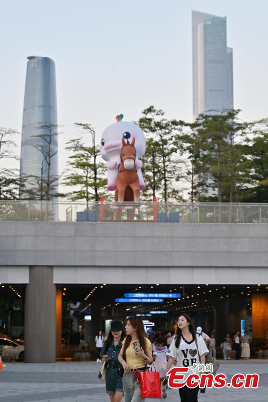Two tourists take photos with Xiyangyang, mascot of 15th National Games, in Guangzhou, Guangdong Province, Oct. 26, 2025. (Photo: China News Service/Chen Chuhong)