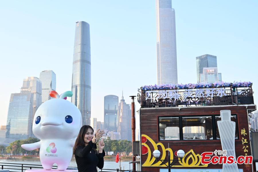 A tourist takes photos with Xiyangyang, mascot of 15th National Games, in Guangzhou, Guangdong Province, Oct. 26, 2025. (Photo: China News Service/Chen Chuhong)