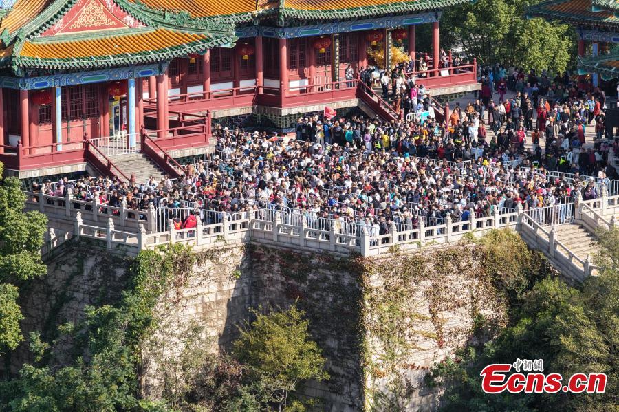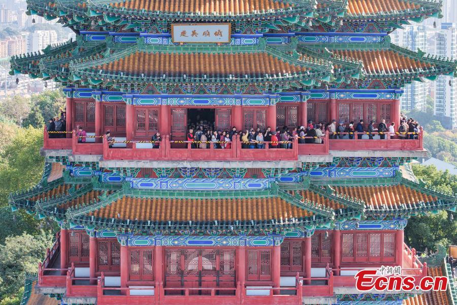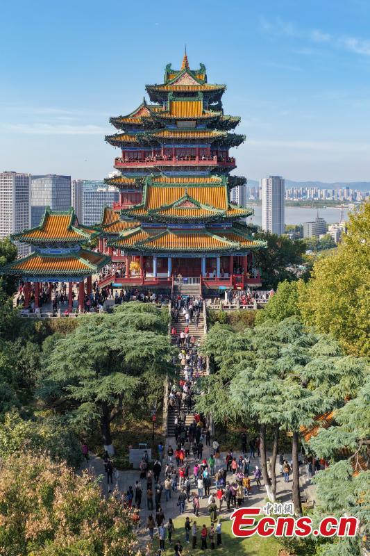 Residents climb Yuejiang Tower to enjoy the scenic views and celebrate the Double Ninth Festival in Nanjing, Jiangsu Province on October 29, 2025. (Photo: China News Service/Yang Bo)