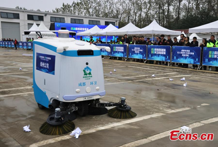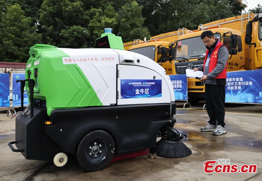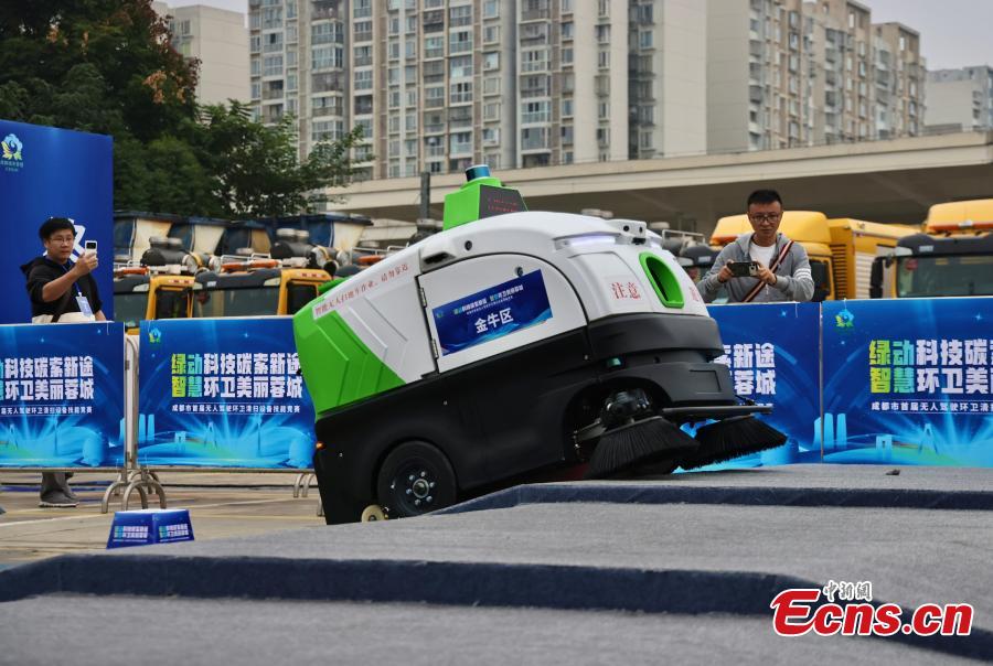 The first unmanned sanitation equipment skills competition was held in Chengdu on Wednesday. Multiple autonomous sanitation vehicles operated in an orderly manner on a simulated urban road course.