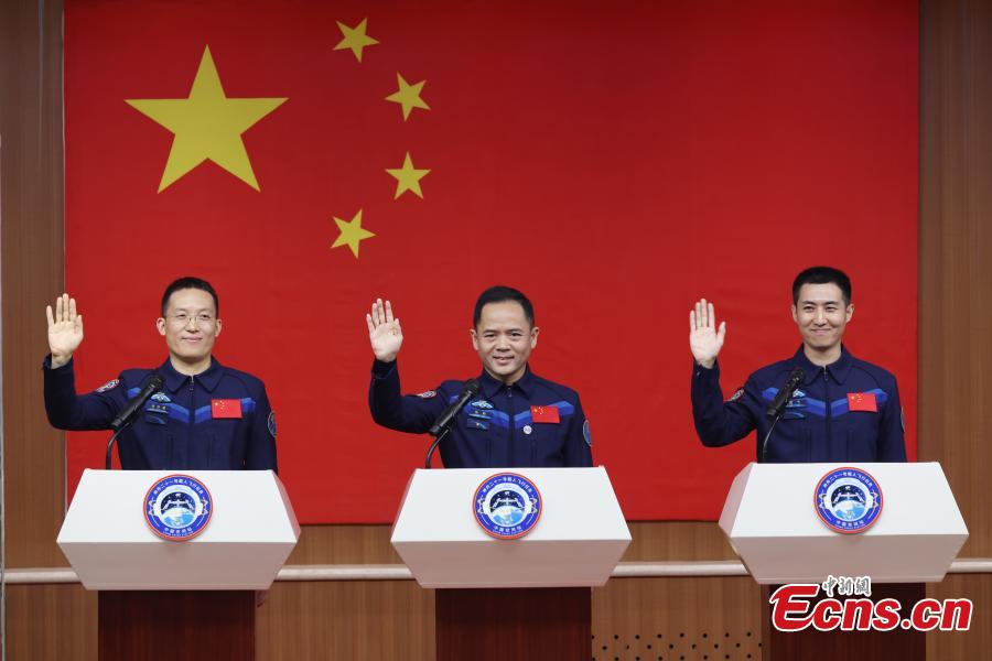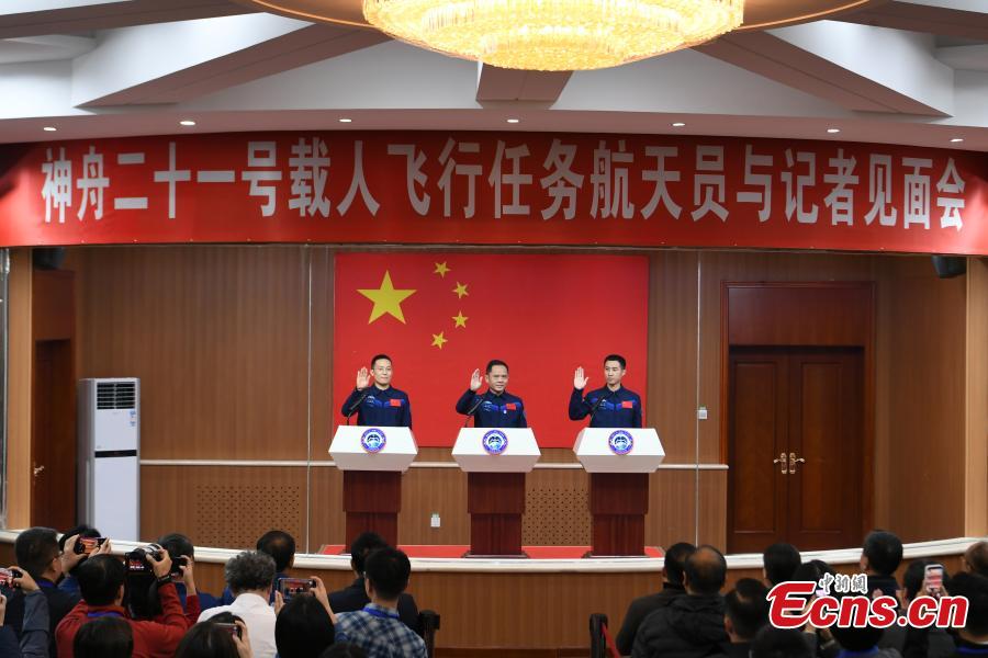 Chinese astronauts Zhang Lu (C), Wu Fei (R) and Zhang Hongzhang for the upcoming Shenzhou-21 spaceflight mission, meet the press in Jiuquan Satellite Launch Center in northwest China on Oct. 30, 2025. (Photo provided to China News Service)
