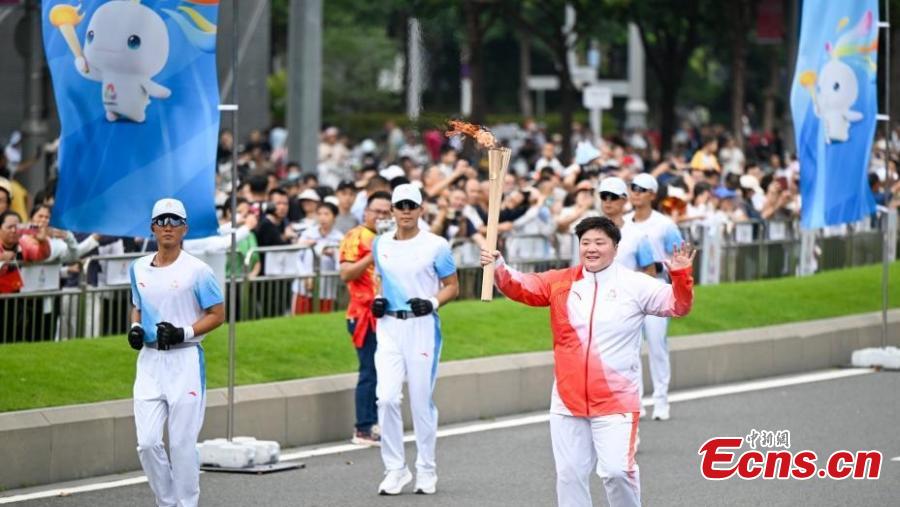 Gong Lijiao, women's shot put gold medalist at the Tokyo Olympics, carries the torch on Nov. 2 in Shenzhen, Guangdong Province. (Photo:China News Service/Chen Jimin)