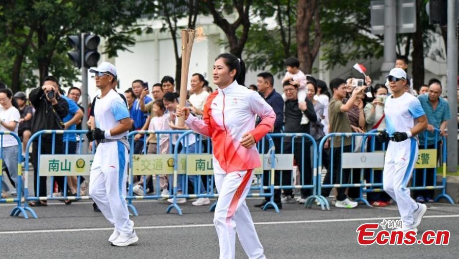 Li Qian, women's 75kg boxing gold medalist at the Paris Olympics, carries the torch on Nov. 2 in Shenzhen, Guangdong Province. (Photo:China News Service/Chen Jimin)