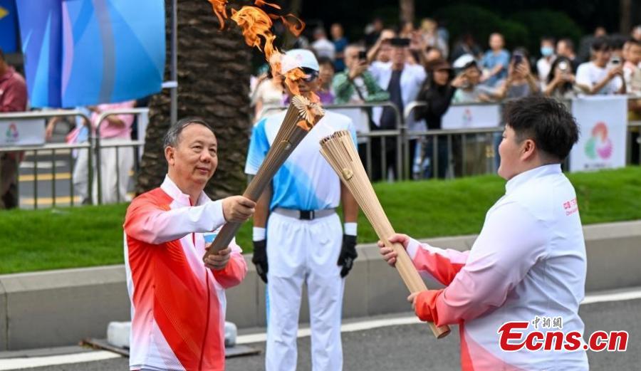 Mao Junfa (left), academician of the Chinese Academy of Sciences and president of Shenzhen University, passes the torch on Nov. 2 in Shenzhen, Guangdong Province. (Photo:China News Service/Chen Jimin)