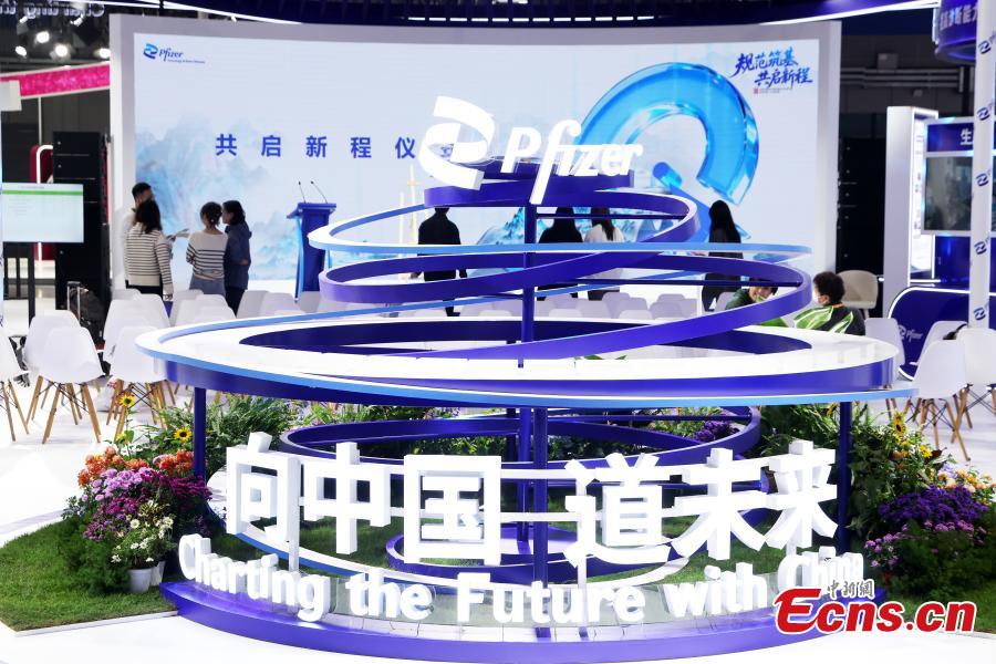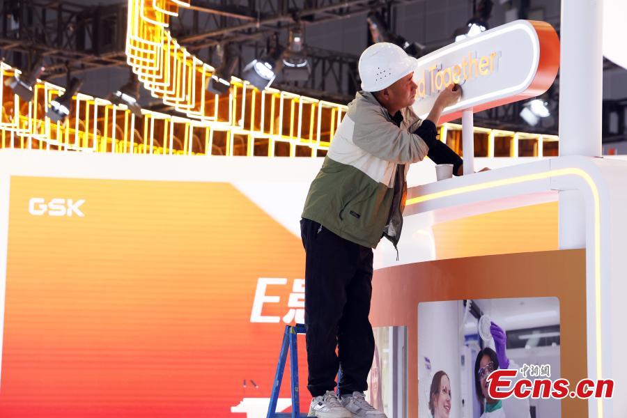 Staff members arrange displays at an exhibition booth on Nov. 2 in Shanghai. (Photo: China News Service/Tang Yanjun)