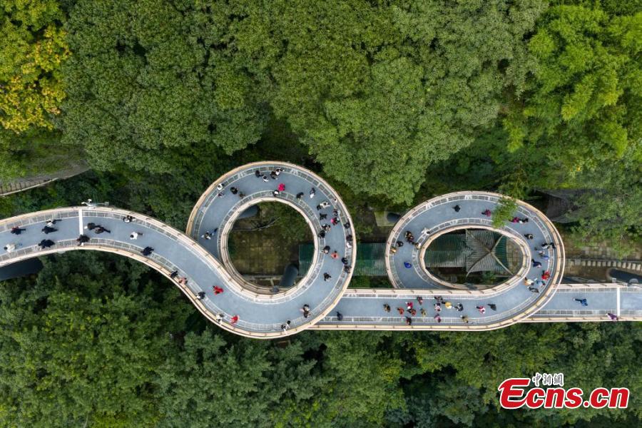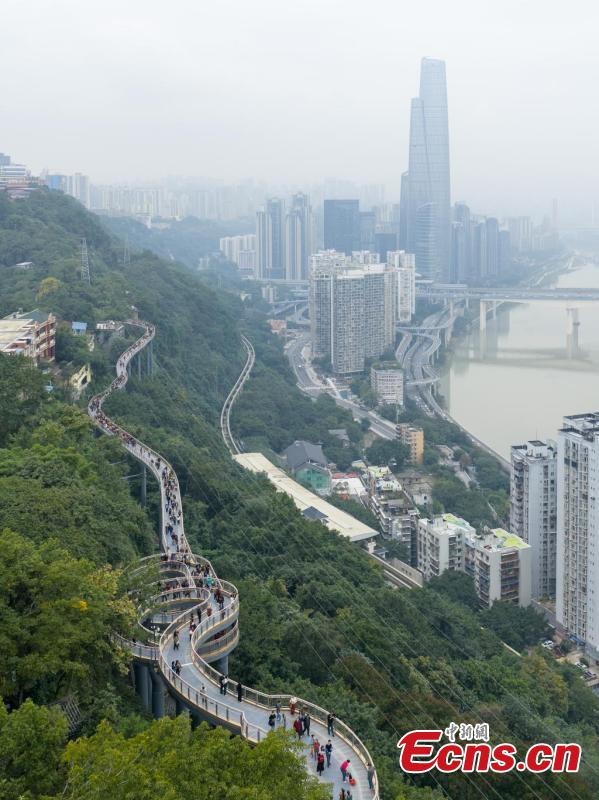 The 460-meter-long and 3-meter-wide bridge, built along the natural cliff north of Eling Park, officially opened to the public on Wednesday. The bridge rises up to 28 meters high and resembles a ribbon winding through the mountains when viewed from above. The footbridge is part of Chongqing’s 28-kilometer Half-Mountain Cliffside Trail system, which connects five urban parks and nearly 30 cultural sites, integrating sightseeing, history, leisure, and fitness.