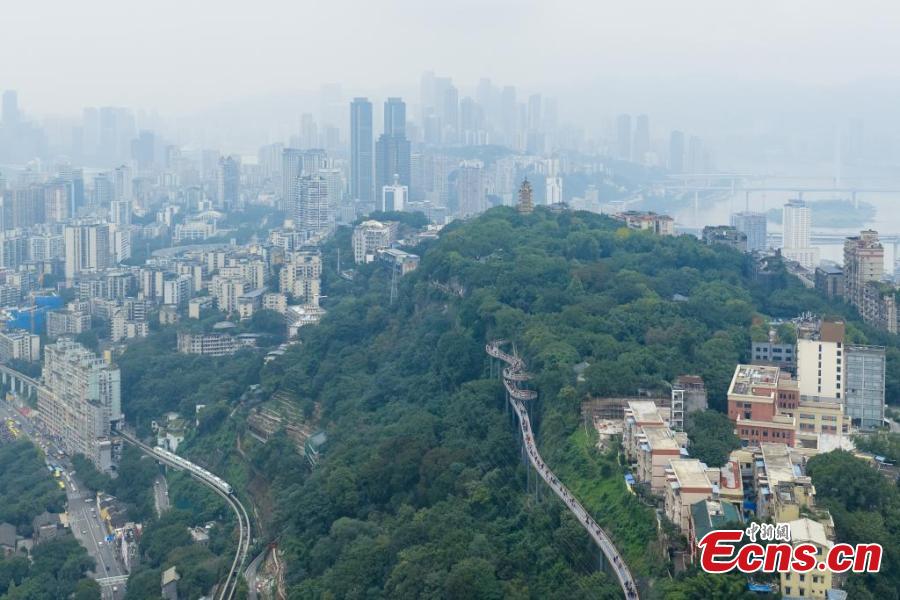 Aerial photo taken on Nov. 12, 2025 shows the Eling Cliffside Footbridge alongside Chongqing Rail Transit Line 2. (Photo: China News Service/He