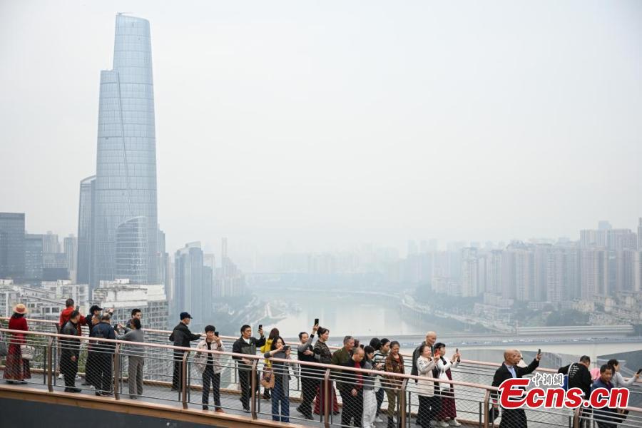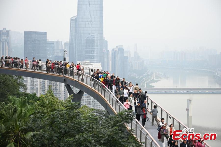 People visit the newly opened Eling Cliffside Footbridge in Chongqing, southwest China, Nov. 12, 2025. (Photo: China News Service/He Penglei)