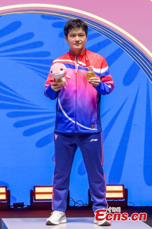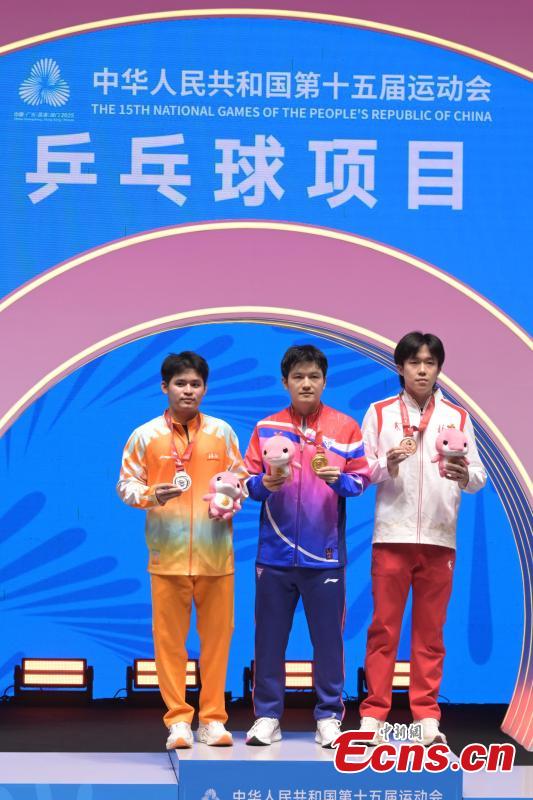 Fan Zhendong of Shanghai poses for a photo during the awarding ceremony for the men's singles of table tennis at China's 15th National Games in Macao, south China, Nov. 16, 2025. (Photo:China News Service/Chen Yongnuo)