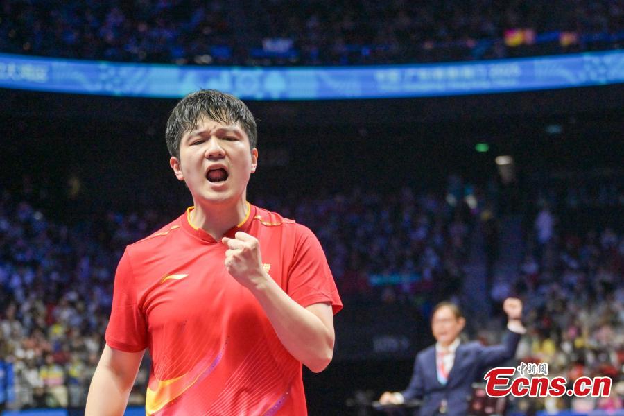 Fan Zhendong of Shanghai competes with Lin Shidong of Hainan during the men's singles final match of table tennis at China's 15th National Games in Macao, south China, Nov. 16, 2025. (Photo: China News Service/Chen Yongnuo)
