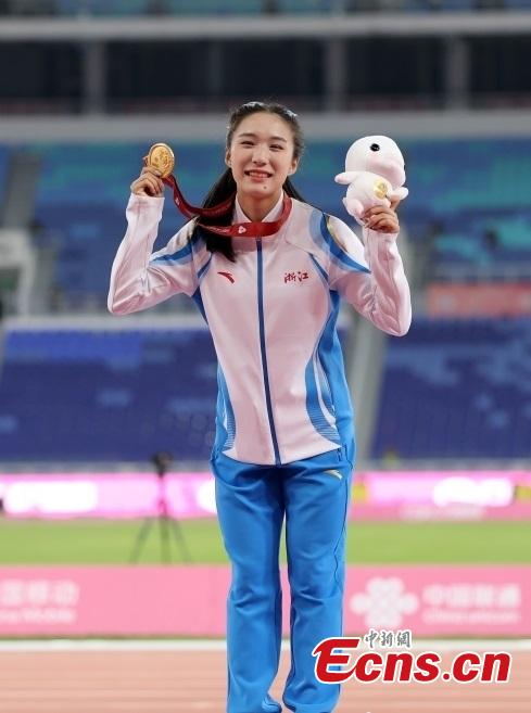 Chen Yujie holds her gold medal for a photo after the women's 100m final of athletics at China's 15th National Games in Guangzhou, south China's Guangdong Province, Nov. 17, 2025. (Photo/China News Service)