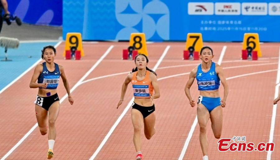 Chen Yujie (center) competes in the women's 100m final of athletics at China's 15th National Games in Guangzhou, south China's Guangdong Province, Nov. 17, 2025. (Photo/China News Service)