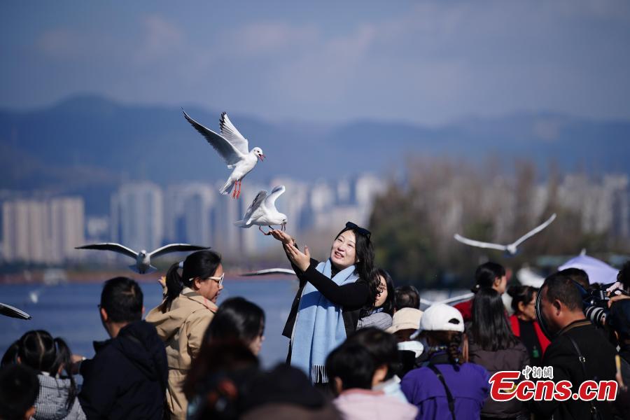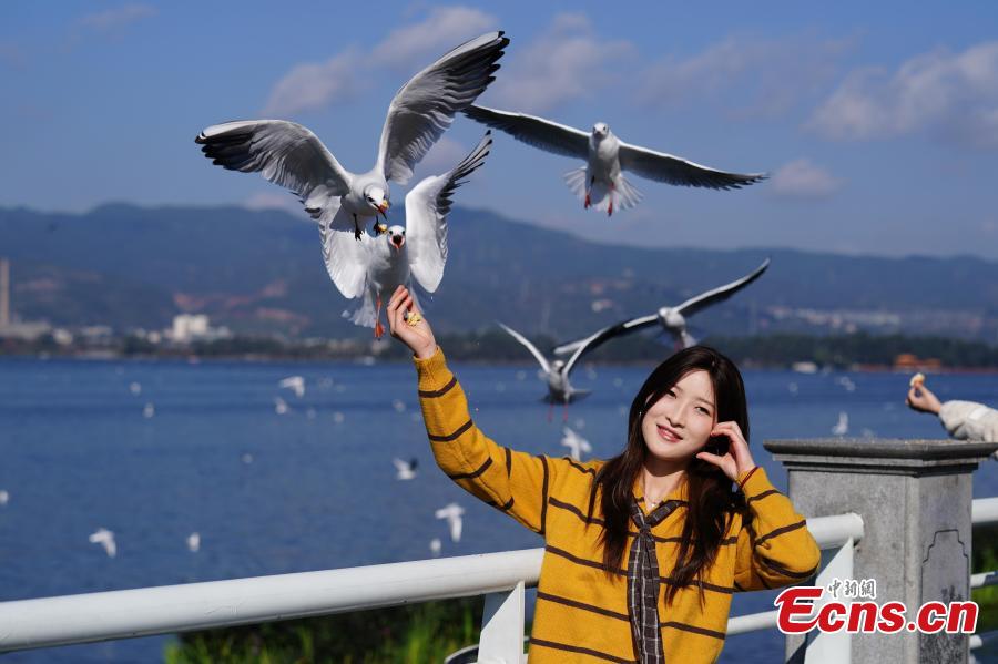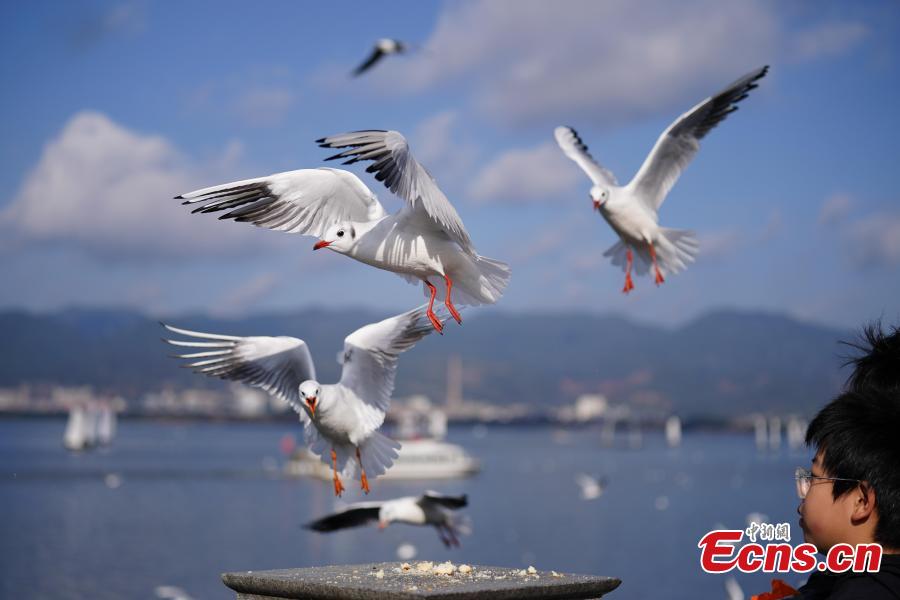 With clear and pleasant weather in Kunming, southwest China's Yunnan?Province, residents and tourists visit the shores of Dianchi Lake to feed the seagulls on Nov. 23, 2025. (Photo: China News Service/Liu Ranyang)