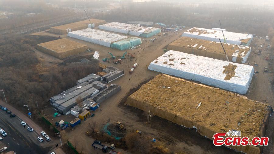 An aerial drone photo taken on Nov. 24, 2025 shows staff members removing the covering on the ice cubes at an ice storage site for the Harbin Ice-Snow World in Harbin, northeast China's Heilongjiang Province. (Photo: China News Service/Zhao Yuhang)
