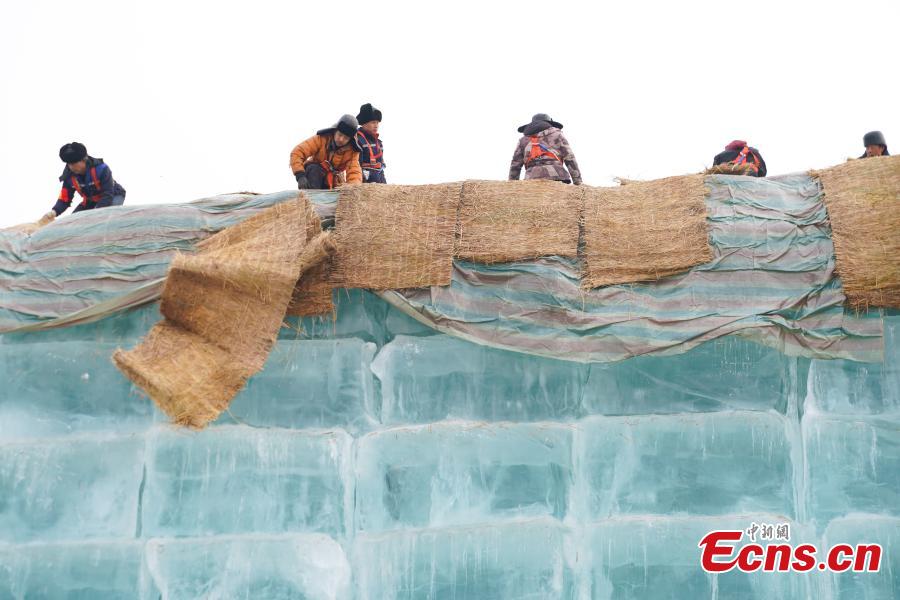 A staff member removes the covering on the ice cubes at an ice storage site for the Harbin Ice-Snow World in Harbin, northeast China's Heilongjiang Province, Nov. 24, 2025. (Photo: China News Service/Zhao Yuhang)