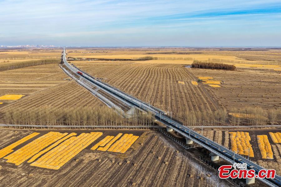 An aerial drone photo taken on Nov. 25, 2025 shows a construction site of the Harbin-Yichun high-speed railway in Qing'an County, northeast China's Heilongjiang Province. (Photo provided to China News Service)