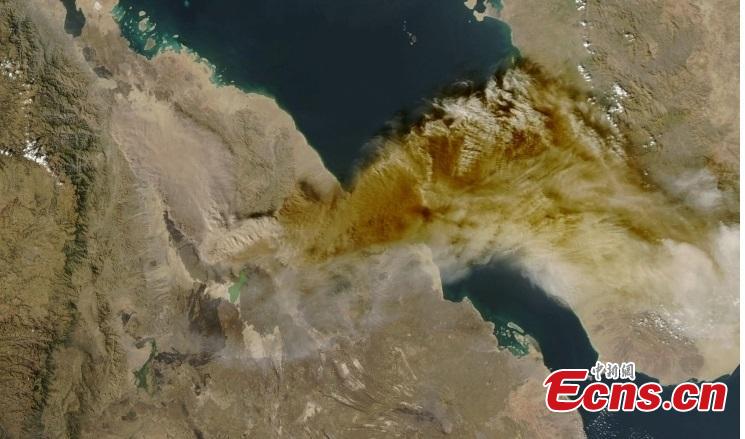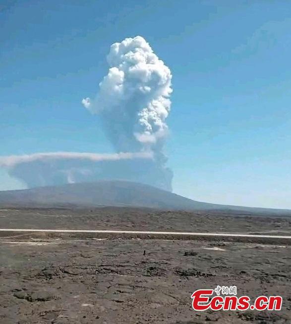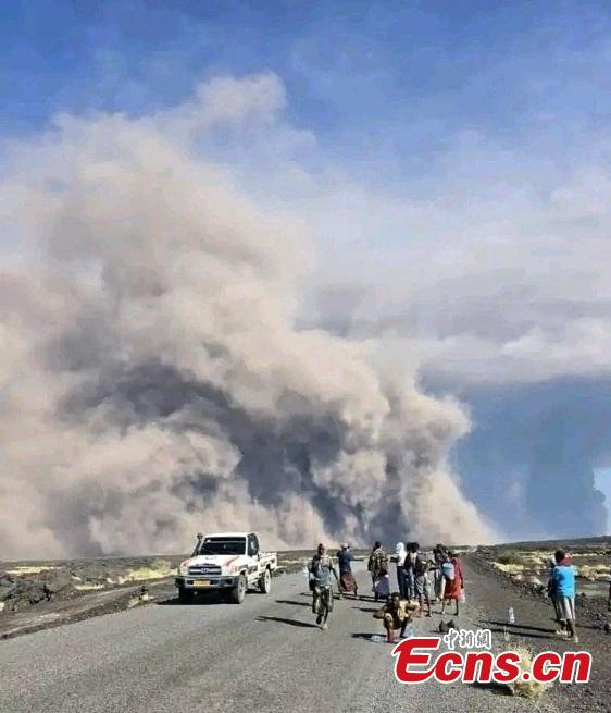 The Hayli Gubbi volcano in the Afar region of northern Ethiopia erupts violently on Nov. 23, 2025, with a towering column of smoke rising straight into the sky. (Photo provided to China News Service)